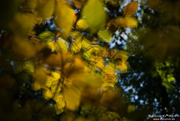 Rot-Buche, Fagus sylvatica, Fagaceae, leuchtendes Herbstlaub vor dunklem Stamm, Doppelbelichtung scharf/unscharf, Westerberg, Göttingen, Deutschland