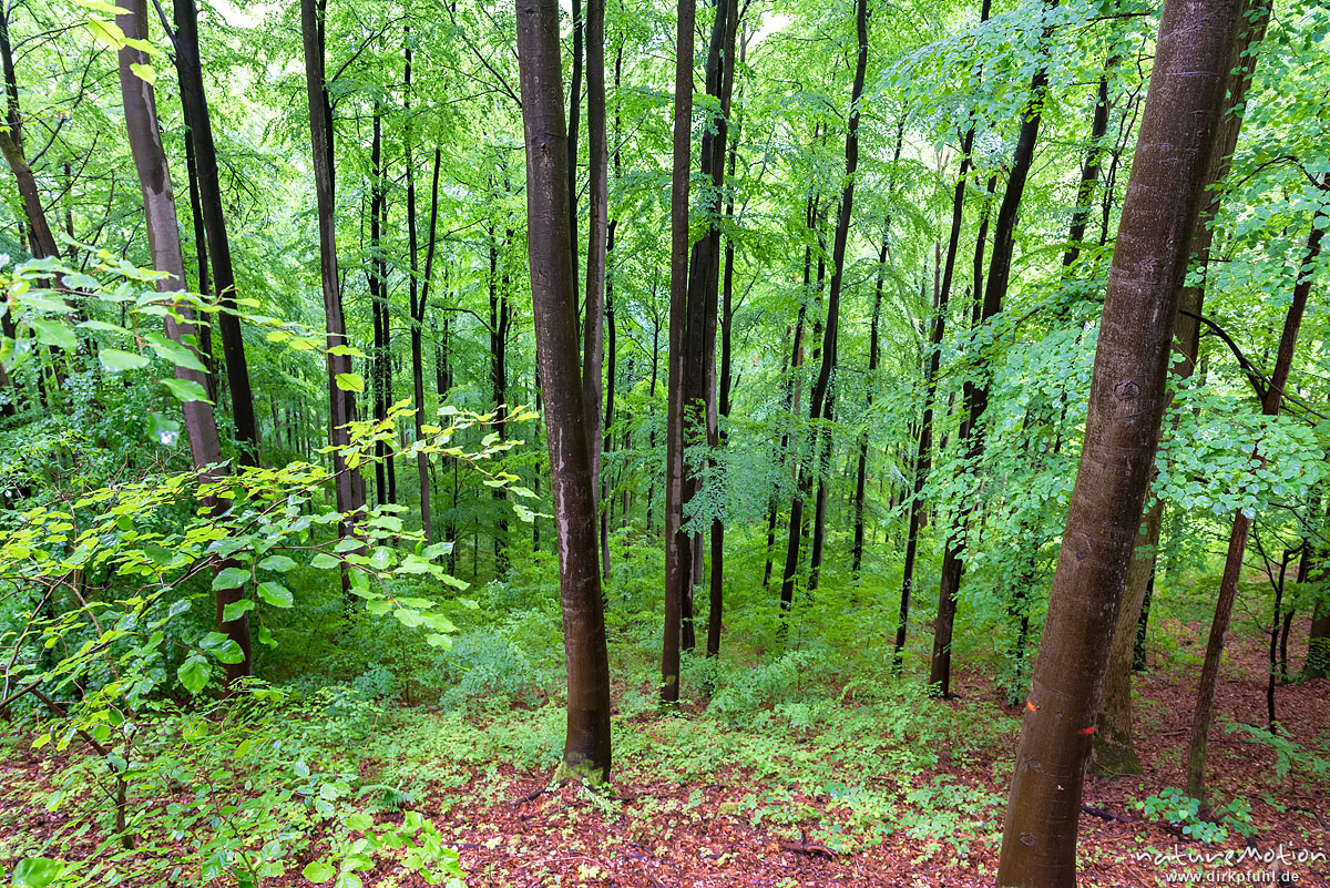 Rot-Buche, Fagus sylvatica, Fagaceae, Stämme, vom Regen dunkel gefärbt, Westerberg, Göttingen, Deutschland