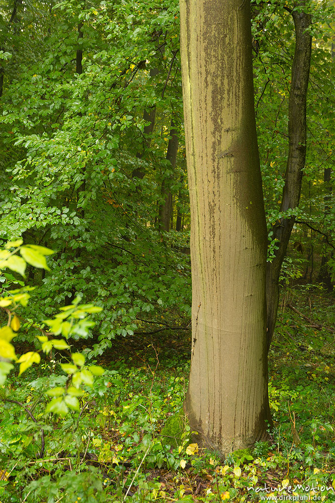Rot-Buche, Fagus sylvatica, Fagaceae, Stamm mit Spuren herablaufenden Wassers, Wuchsform der Buche mit steil nach oben abgehenden Ästen leitet Regen zum Stamm und damit zu den Wurzeln, Geismarer Wald, Göttingen, Deutschland