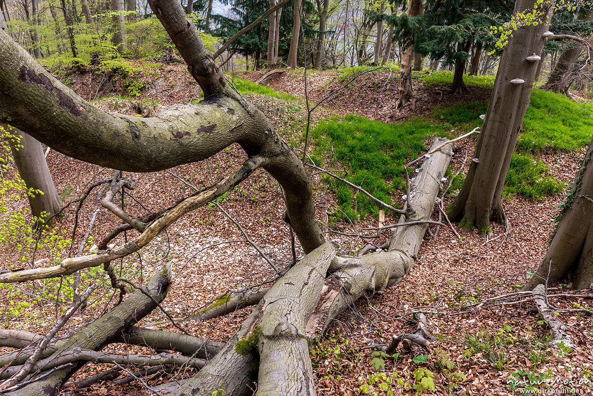 Rot-Buche, Fagus sylvatica, Fagaceae, umgestürzter Baum mit Pilzbewuchs, Asbach-Sickenberg, Deutschland