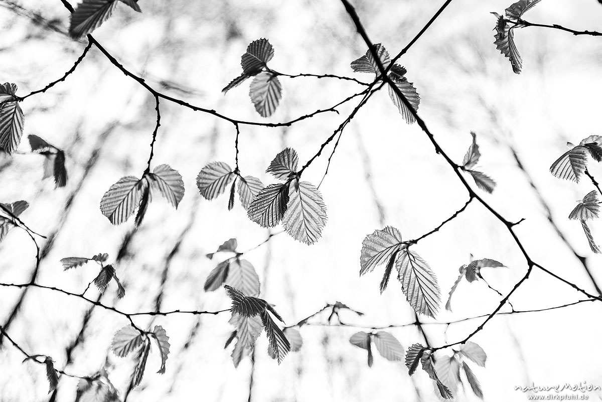 Rot-Buche, Fagus sylvatica, Fagaceae, Zweige mit frisch ausgetriebenem Laub, Trift, Schwarz/Weiß, Göttingen, Deutschland