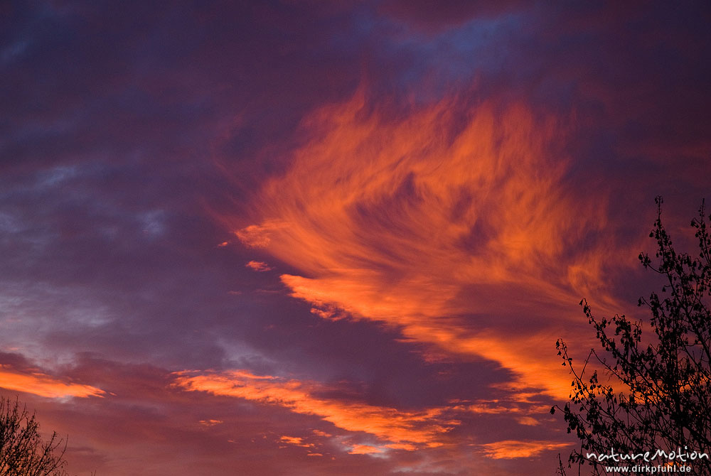 Rot leuchtende Wolken beim Sonnenaufgang, Göttingen, Deutschland