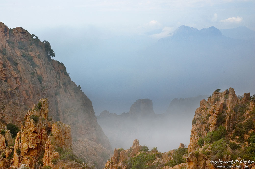 rote Felsen der Calanche, bizarr erodiert, Wolken, Korsika, Frankreich