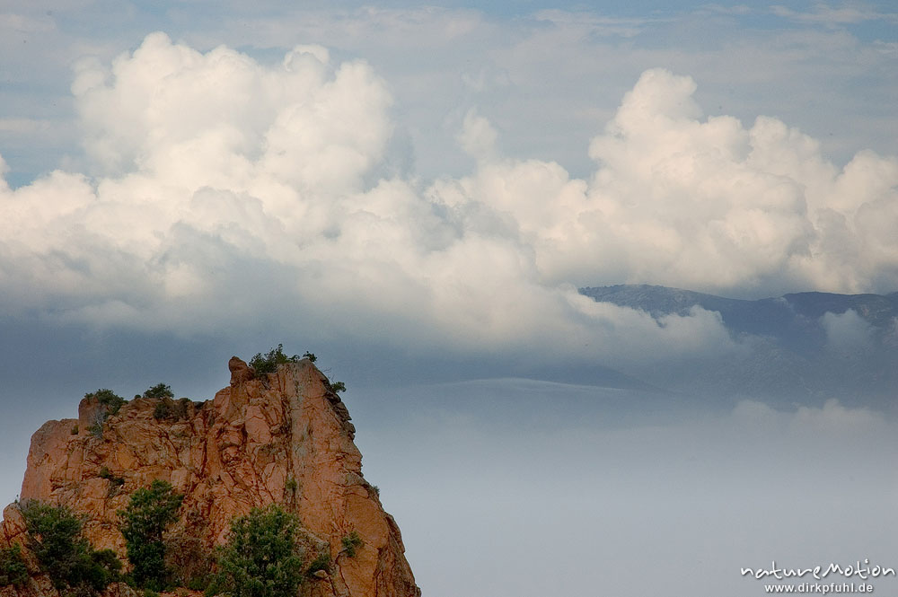 rote Felsen der Calanche, bizarr erodiert, Wolken, Korsika, Frankreich