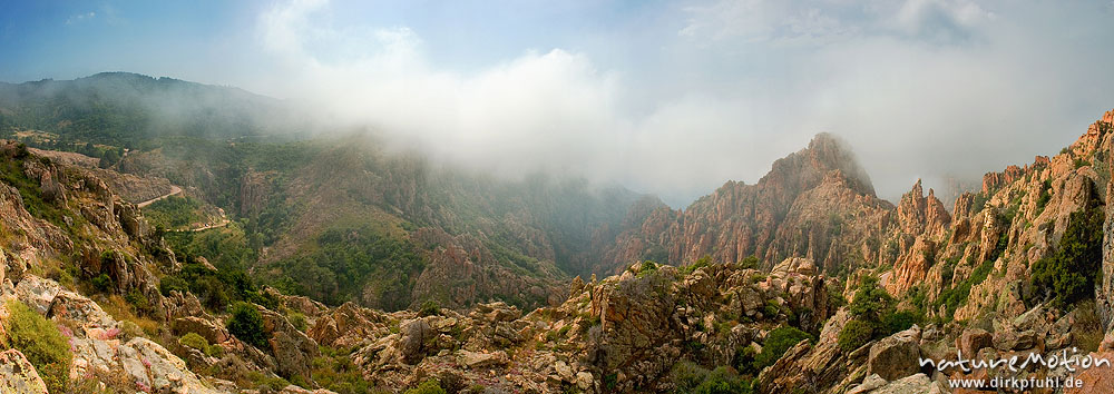 rote Felsen der Calanche, bizarr erodiert, Wolken Korsika, Frankreich