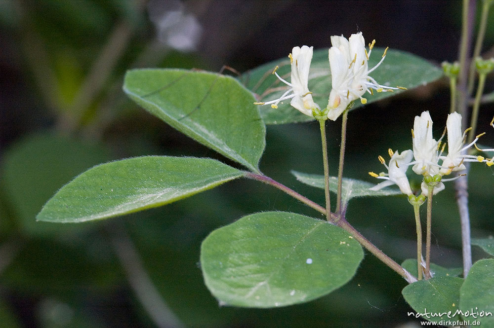 Rote Heckenkirsche, Lonicera xylosteum, Caprifoliaceae, Blütenstände und Blätter, Drakenberg Göttingen, Deutschland