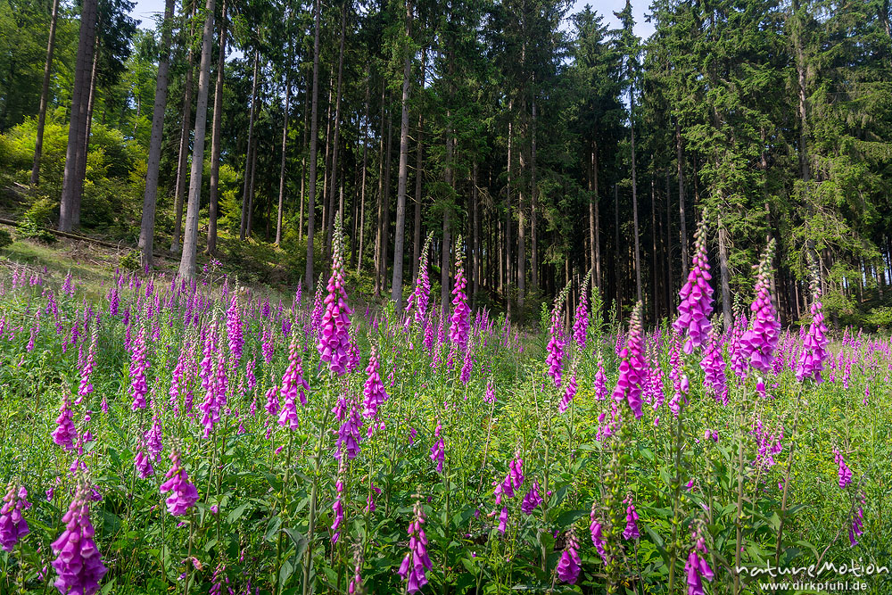Roter Fingerhut, Digitalis purpurea, Scrophulariaceae, dichter Bestand blühender Pflanzen auf einem Holzeinschlag / Lichtung, NSG Liesetal, Liesetal (Sauerland), Deutschland
