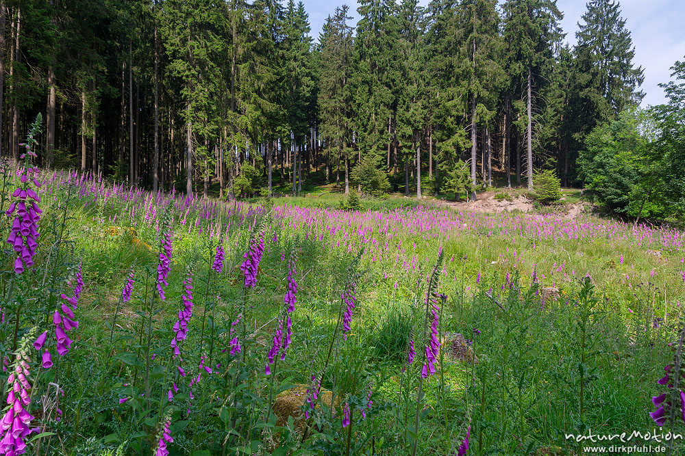 Roter Fingerhut, Digitalis purpurea, Scrophulariaceae, dichter Bestand blühender Pflanzen auf einem Holzeinschlag / Lichtung, NSG Liesetal, Liesetal (Sauerland), Deutschland