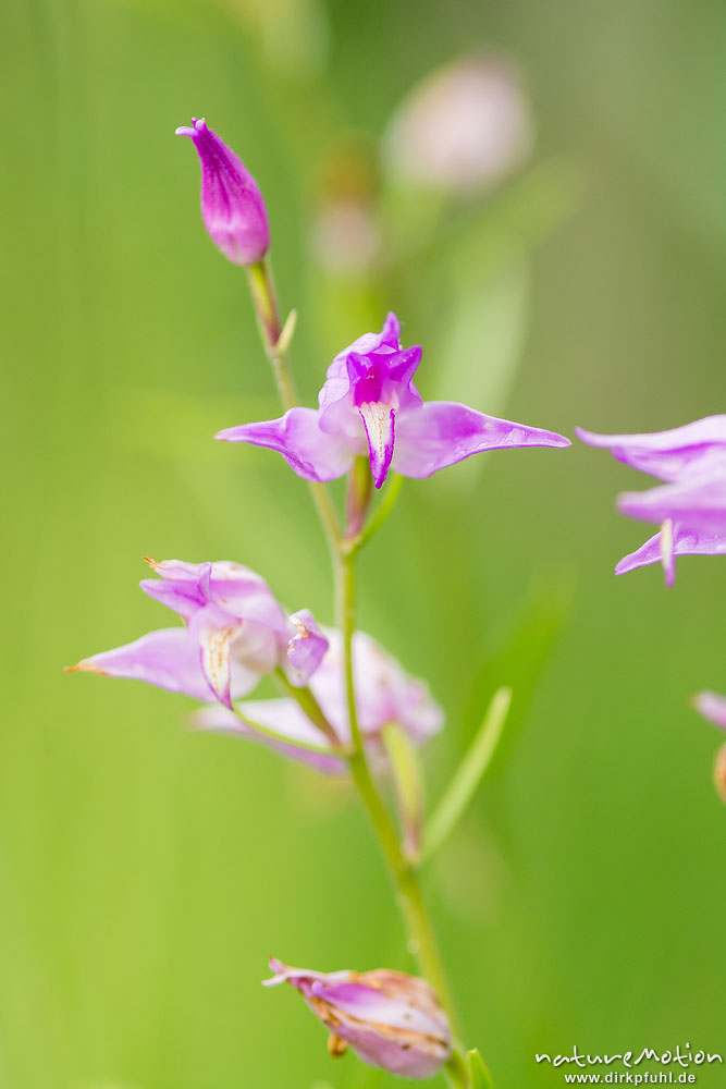 Rotes Waldvöglein, Cephalanthera rubra, Orchideen (Orchidaceae), Blütenstand, Uferbereich des Weißenbachsees, Füssen, Deutschland