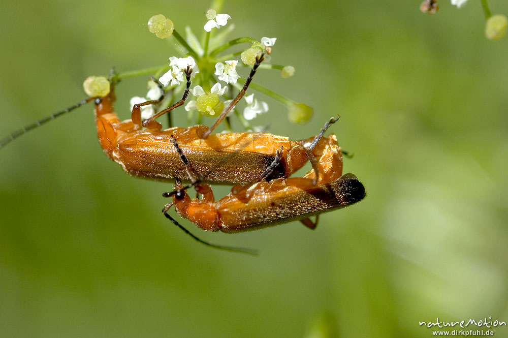 Rotgelber Weichkäfer, Rhagonycha spec., Cantharidae, Paarung, Gartetal, Deutschland
