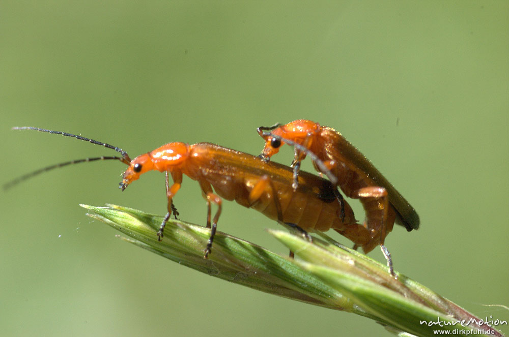 Rotgelber Weichkäfer, Rhagonycha spec., Cantharidae, Paarung Gartetal, Deutschland