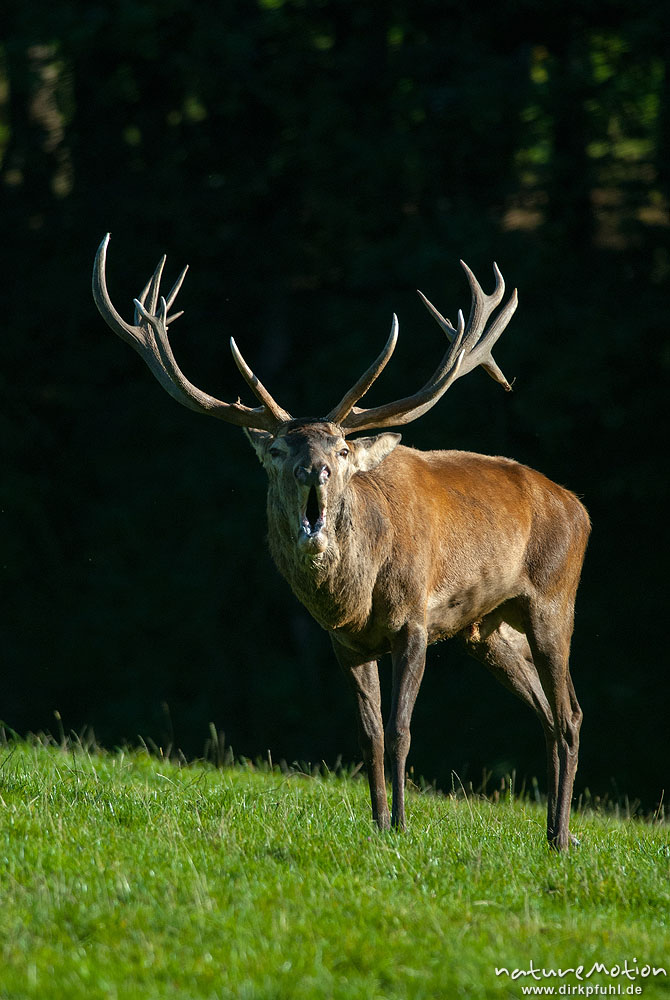 Rothirsch, Cervus elaphus, Cervidae, Männchen bei der Brunft, röhrt, Tierpark Neuhaus, captive, Neuhaus, Deutschland