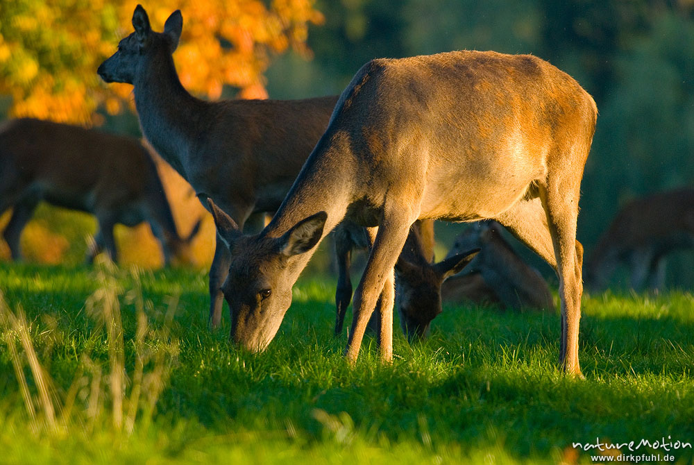 Rothirsch, Cervus elaphus, Cervidae, Weibchen beim äsen auf Wiese, Tiergehege, Tierpark Neuhaus, captive, Neuhaus, Deutschland