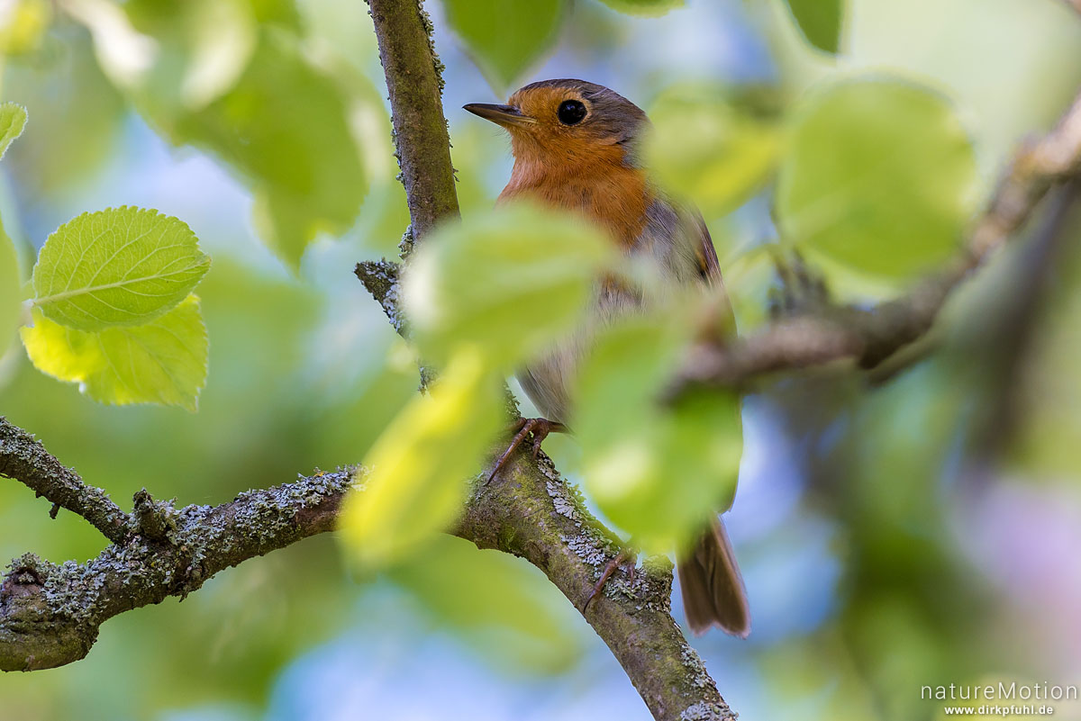 Rotkehlchen, Erithacus rubecula, Fliegenschnäpper (Muscicapidae), sitzt im Geäst eines Apelbaums, Am Weißen Steine, Göttingen, Deutschland