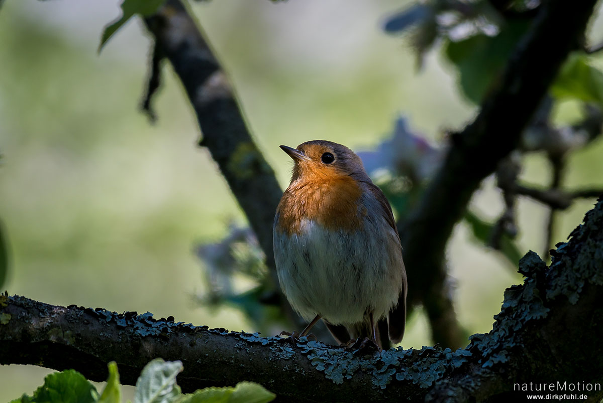 Rotkehlchen, Erithacus rubecula, Fliegenschnäpper (Muscicapidae), sitzt im Geäst eines Apelbaums, Am Weißen Steine, Göttingen, Deutschland