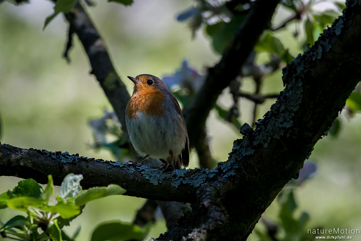 Rotkehlchen, Erithacus rubecula, Fliegenschnäpper (Muscicapidae), sitzt im Geäst eines Apelbaums, Am Weißen Steine, Göttingen, Deutschland