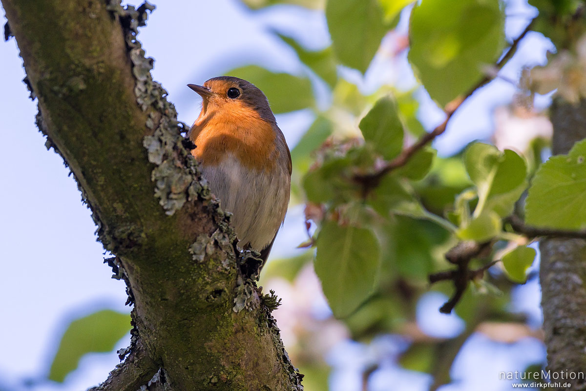 Rotkehlchen, Erithacus rubecula, Fliegenschnäpper (Muscicapidae), sitzt im Geäst eines Apelbaums, Am Weißen Steine, Göttingen, Deutschland