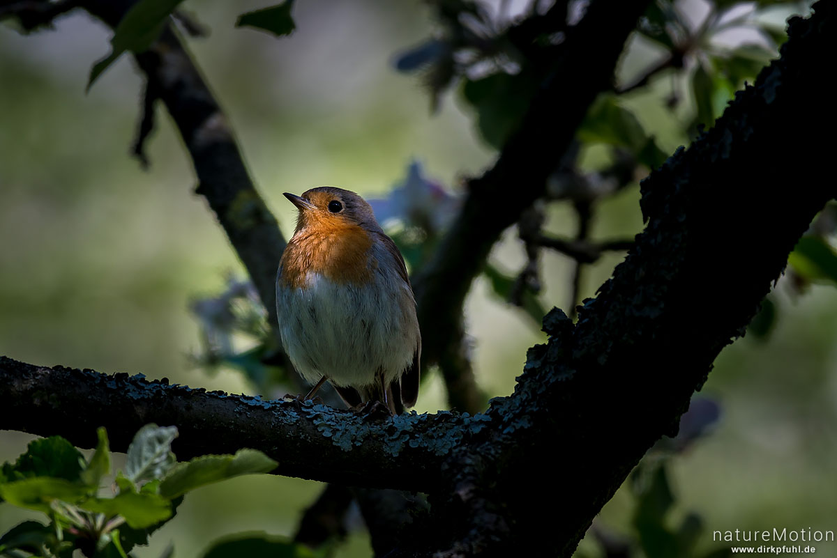 Rotkehlchen, Erithacus rubecula, Fliegenschnäpper (Muscicapidae), Tier sitzt im Geäst eines Apfelbaums, Am Weißen Steine, Göttingen, Deutschland