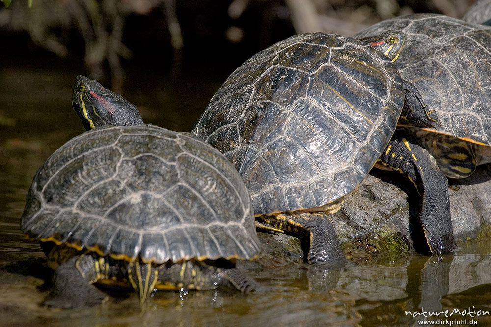 Rotwangen-Schmuckschildkröte, Trachemys scripta elegans, Emydidae, mehrere Tiere beim sonnenbaden au, Göttingen, Deutschland