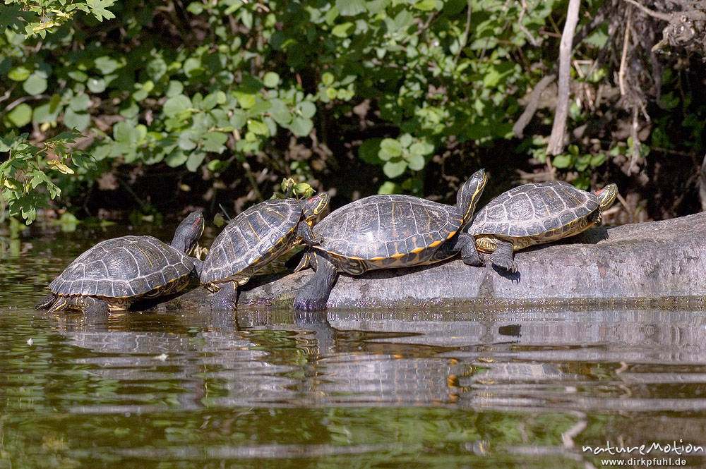 Rotwangen-Schmuckschildkröte, Trachemys scripta elegans, Emydidae, mehrere Tiere beim sonnenbaden auf einem ins Wasser ragenden Baumstamm, Kiessee, Göttingen, Deutschland