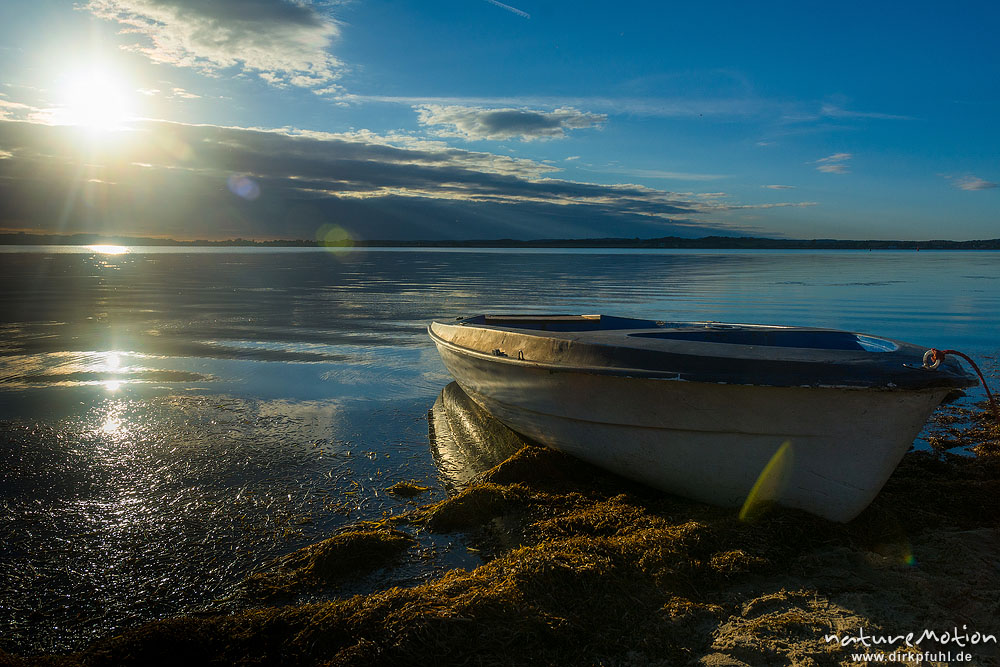Rudeboot an der Boddenküste, Abendlicht, Gager, Rügen, Deutschland