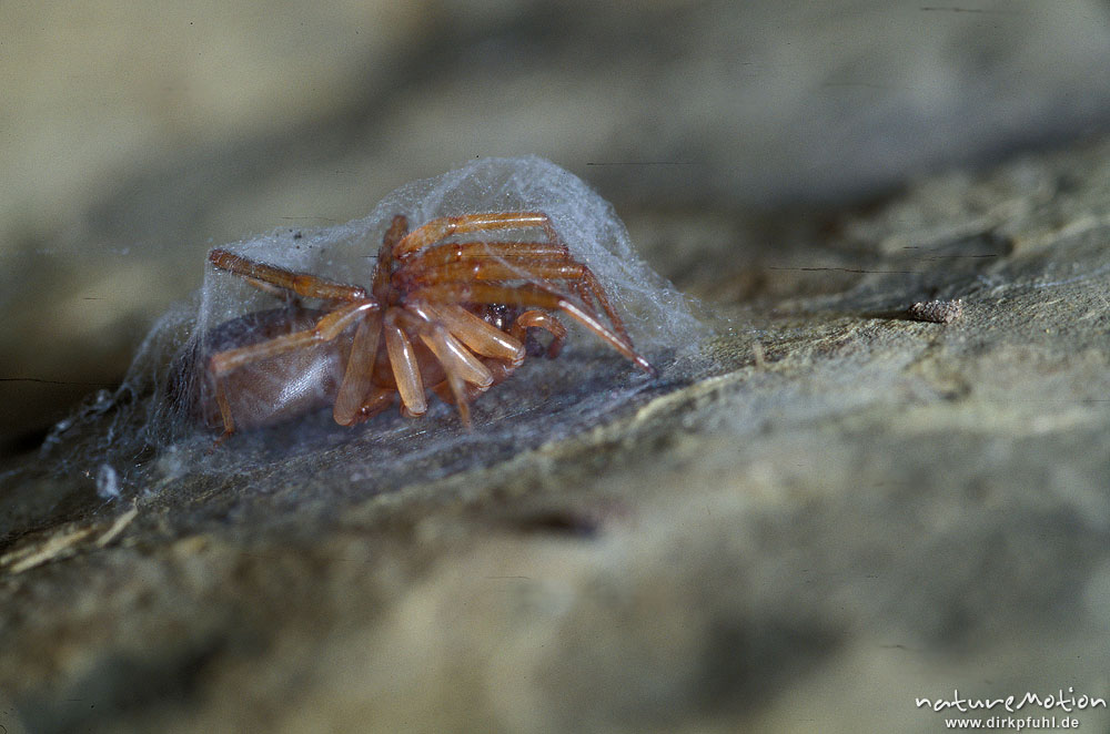 Sackspinne, Clubionidae (Artname unbekannt) in Gespinst unter Stein, typisches Versteck, Stein umgedreht, Unterseite, Göttingen, Deutschland