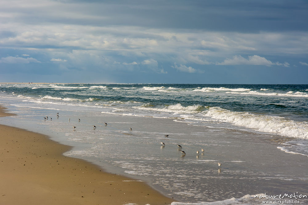 Sanderling, Calidris alba, Schnepfenvögel (Scolopacidae), Gruppe von Tieren bei der Nahrungssuche im Spülsaum, Nordstrand, Borkum, Deutschland