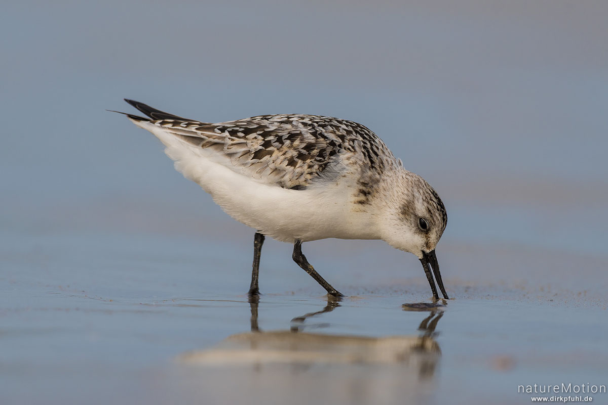 Sanderling, Calidris alba, Schnepfenvögel (Scolopacidae), Nahrungssuche im Spülsaum, Spiekeroog, Deutschland