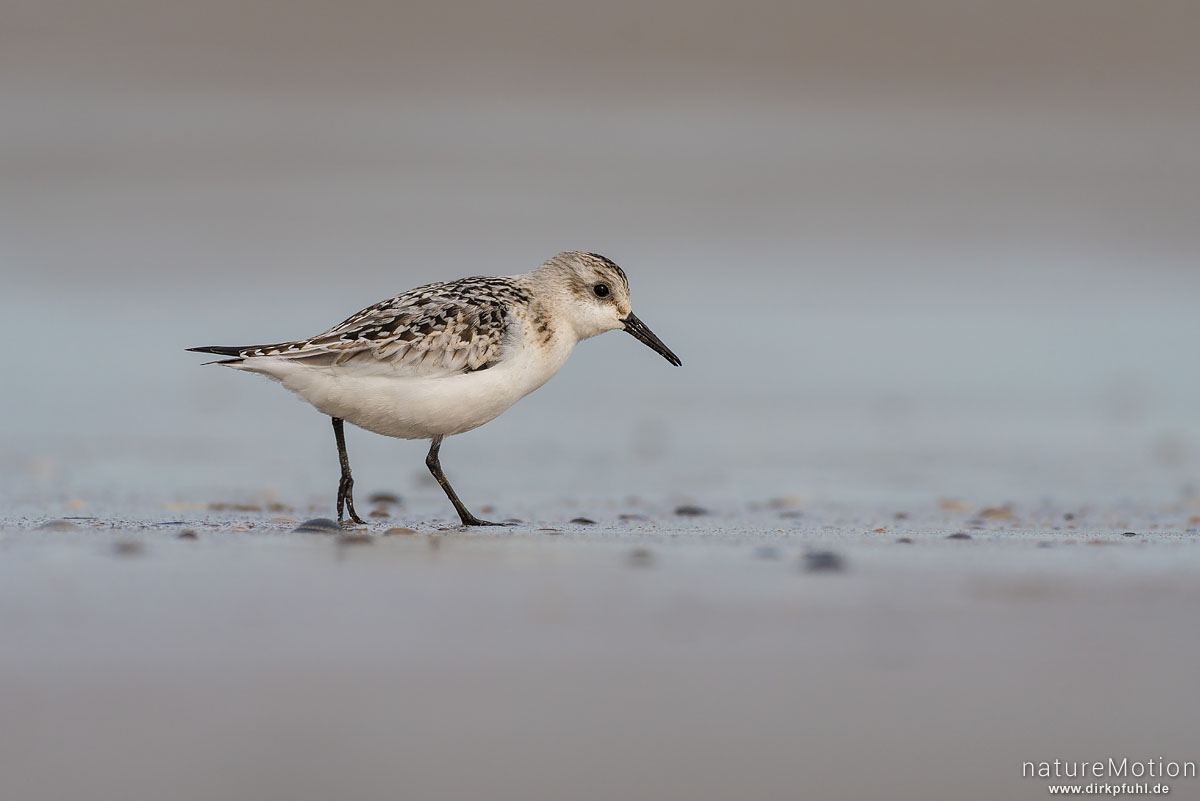 Sanderling, Calidris alba, Schnepfenvögel (Scolopacidae), Nahrungssuche im Spülsaum, Spiekeroog, Deutschland
