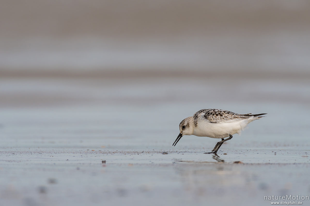 Sanderling, Calidris alba, Schnepfenvögel (Scolopacidae), Nahrungssuche im Spülsaum, Spiekeroog, Deutschland