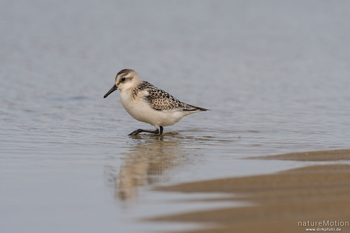 Sanderling, Calidris alba, Schnepfenvögel (Scolopacidae), Nahrungssuche in Priel, Spiekeroog, Deutschland