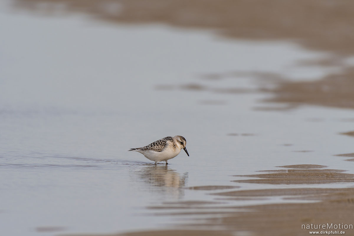 Sanderling, Calidris alba, Schnepfenvögel (Scolopacidae), Nahrungssuche in Priel, Spiekeroog, Deutschland