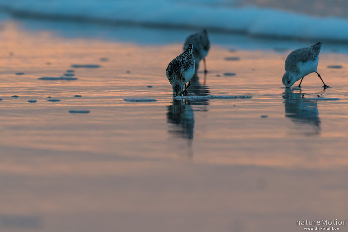Sanderling, Calidris alba, Schnepfenvögel (Scolopacidae), Tiere bei der Nahrungssuche im Spülsaum, Sonnenuntergang mit rötlichem Licht, Spiekeroog, Deutschland