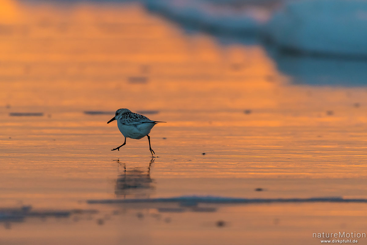 Sanderling, Calidris alba, Schnepfenvögel (Scolopacidae), Tiere bei der Nahrungssuche im Spülsaum, Sonnenuntergang mit rötlichem Licht, Spiekeroog, Deutschland