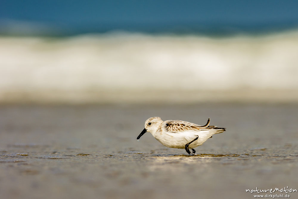 Sanderling, Calidris alba, Schnepfenvögel (Scolopacidae), Tiere bei Nahrungsdsucche im Spülsaum, Oststrand bei auflaufendem Wasser, Borkum, Deutschland