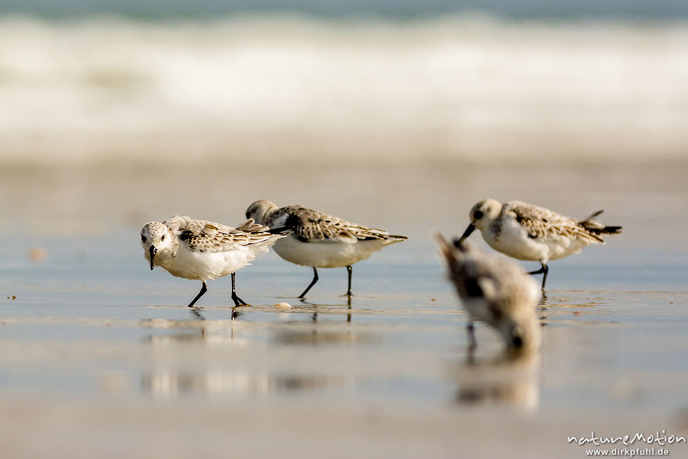 Sanderling, Calidris alba, Schnepfenvögel (Scolopacidae), Tiere bei Nahrungsdsucche im Spülsaum, Oststrand bei auflaufendem Wasser, Borkum, Deutschland