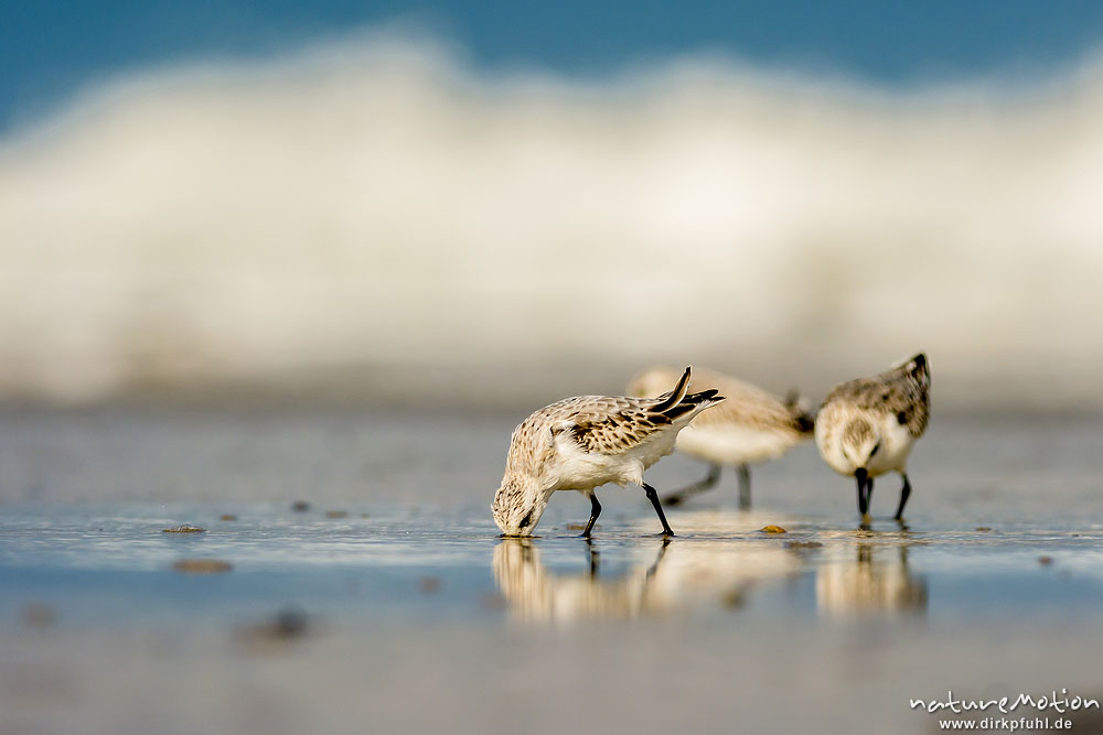 Sanderling, Calidris alba, Schnepfenvögel (Scolopacidae), Tiere bei Nahrungsdsucche im Spülsaum, Oststrand bei auflaufendem Wasser, Borkum, Deutschland