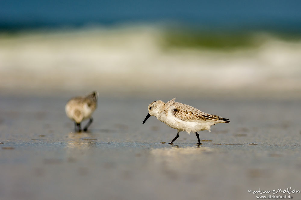 Sanderling, Calidris alba, Schnepfenvögel (Scolopacidae), Tiere bei Nahrungsdsucche im Spülsaum, Ost, Borkum, Deutschland