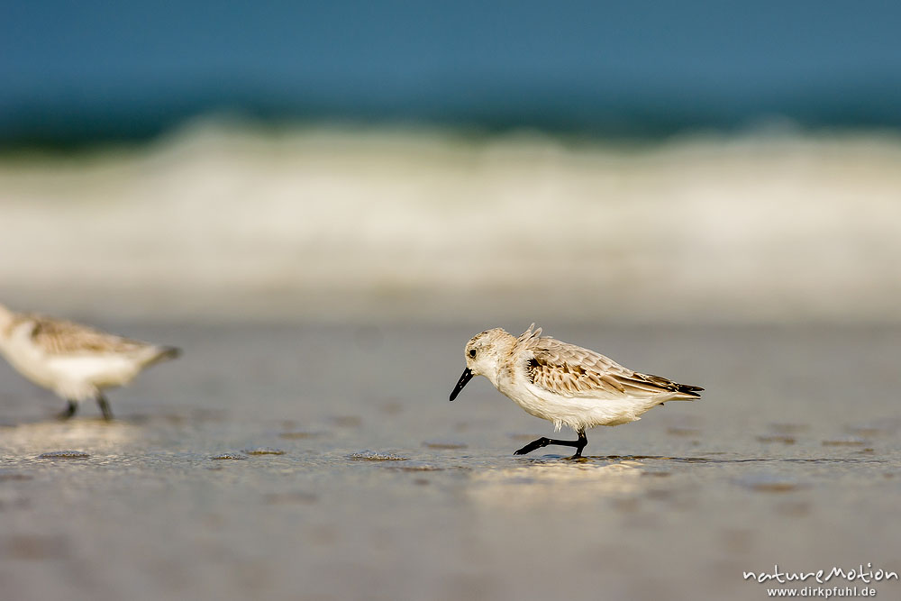 Sanderling, Calidris alba, Schnepfenvögel (Scolopacidae), Tiere bei Nahrungsdsucche im Spülsaum, Oststrand bei auflaufendem Wasser, Borkum, Deutschland
