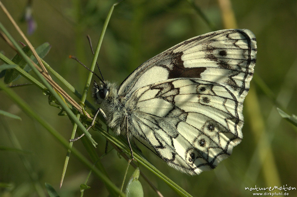 Schachbrett, Melanargea galathea, sitzend zwischen Pflanzen, Groner Bahndamm Göttingen, Deutschland