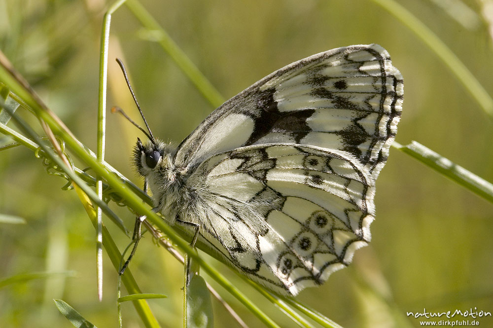 Schachbrett, Melanargea galathea, sitzend zwischen Pflanzen, Groner Bahndamm, Göttingen, Deutschland