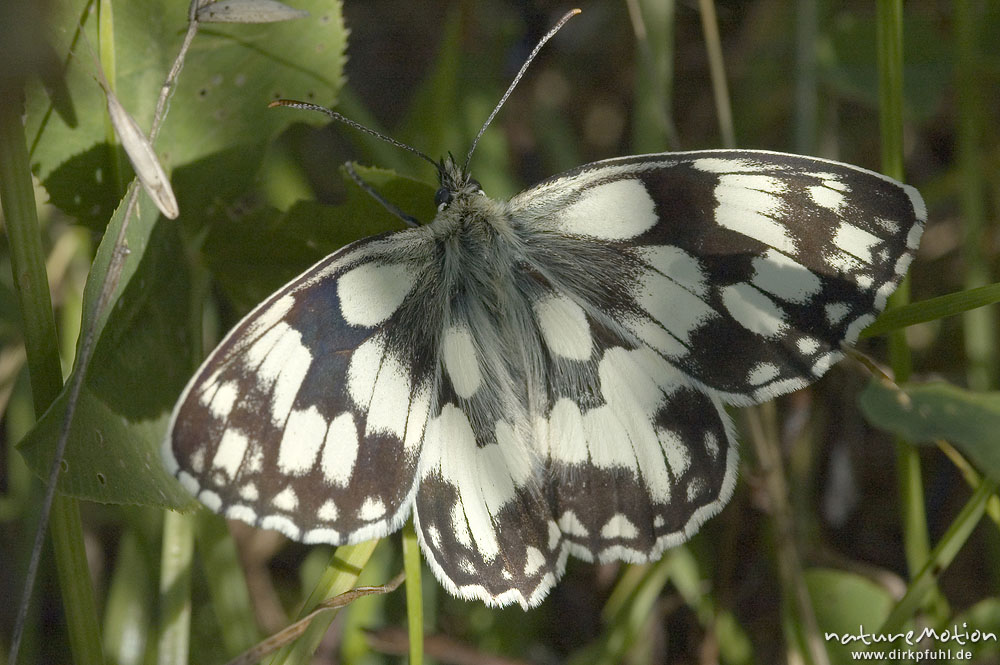 Schachbrett, Melanargea galathea, sitzend zwischen Pflanzen, Groner Bahndamm, Göttingen, Deutschland