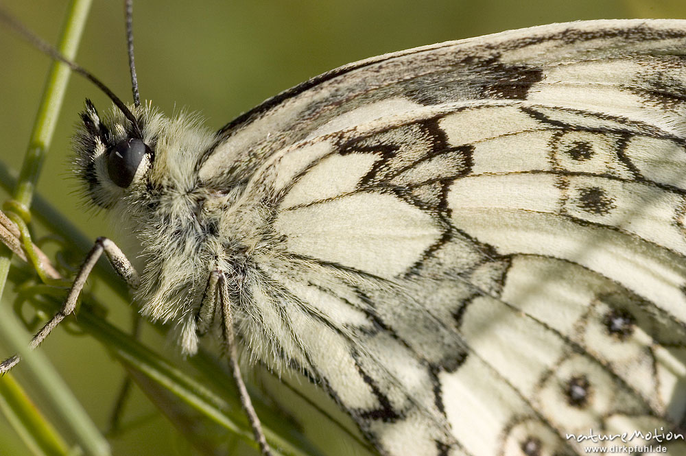 Schachbrett, Melanargea galathea, sitzend zwischen Pflanzen, Groner Bahndamm, Göttingen, Deutschland