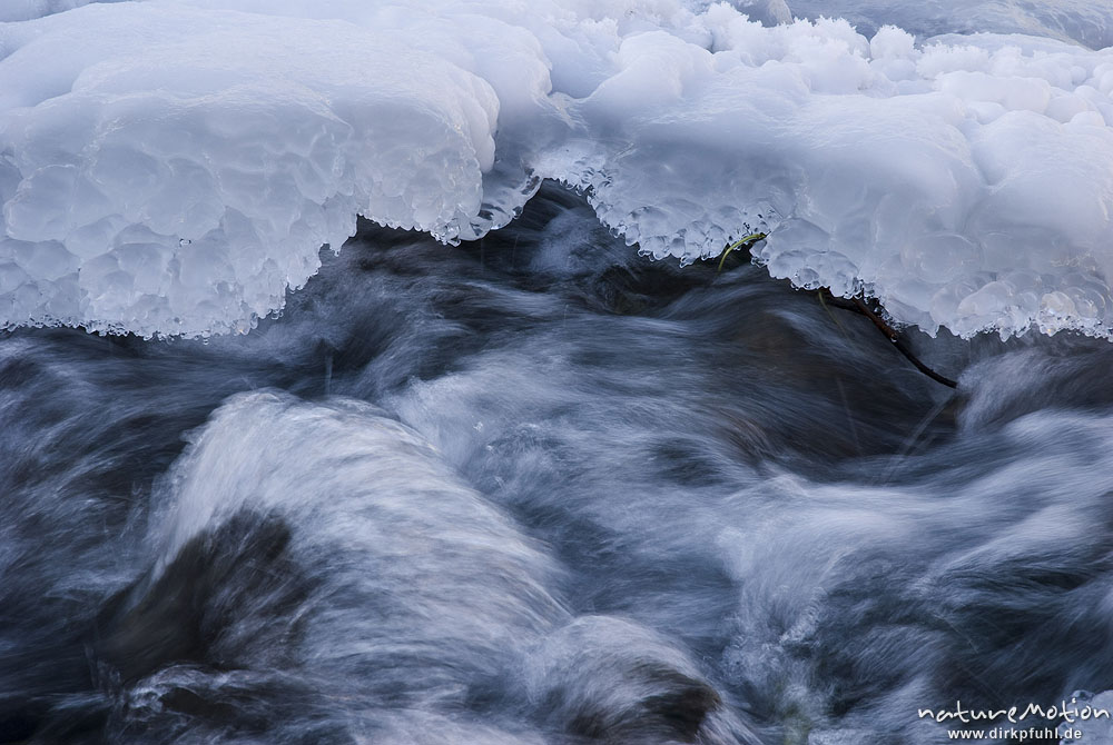 schäumender Bach umrahmt von dicker Eisdecke, Zulauf zum Kiessee Göttingen, Deutschland