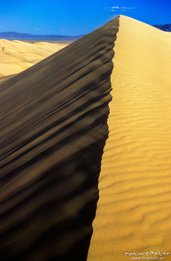scharfer Grat einer Wanderdüne im plastischen Abendlicht, Sandrippel, wehender Sand, Chongorin Els, Mongolei