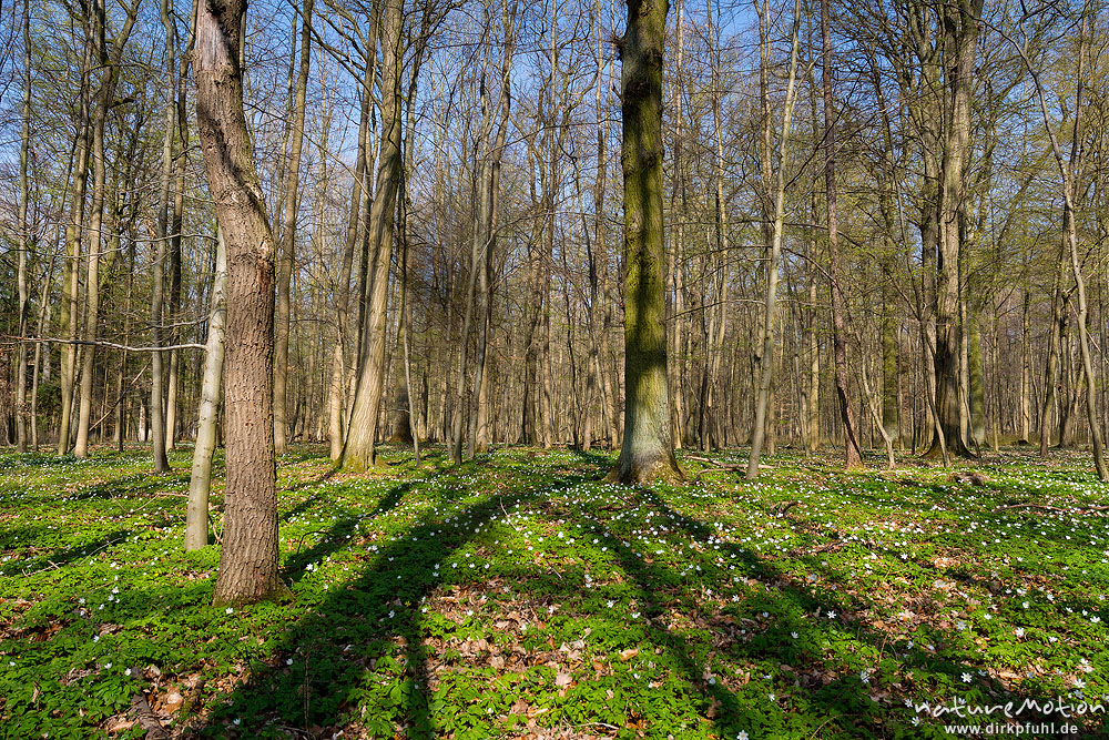 Schatten auf dem Waldboden, Buschwindröschen in dichtem Bestand im noch lichten Buchenwald, Westerbe, Göttingen, Deutschland
