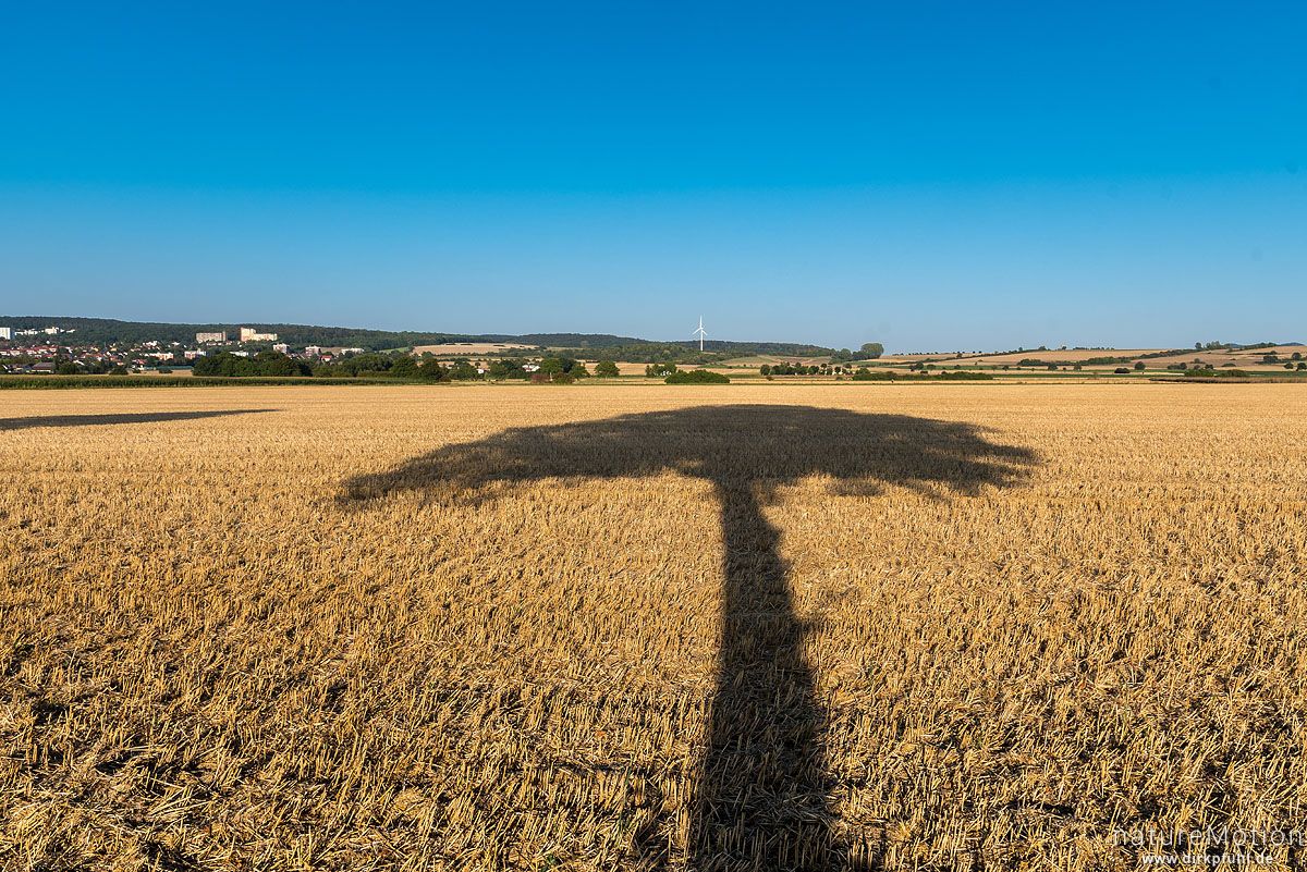 Schatten eines Baumes auf abgeerntetem Feld, Leinetal, Göttingen, Deutschland