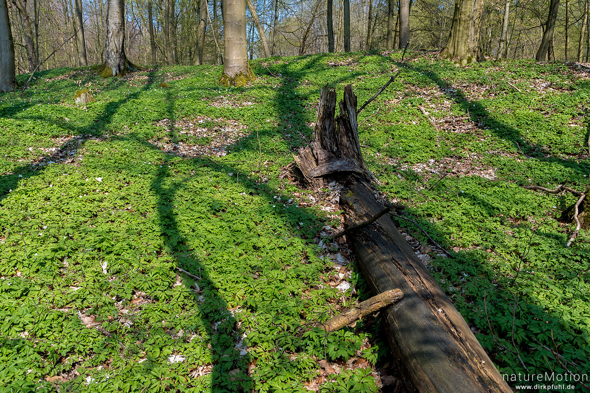 Schatten von Baumstämmen auf dem Waldboden, Buschwindröschen, Fischteiche an der Uffe, Karstweg, Walkenried, Deutschland
