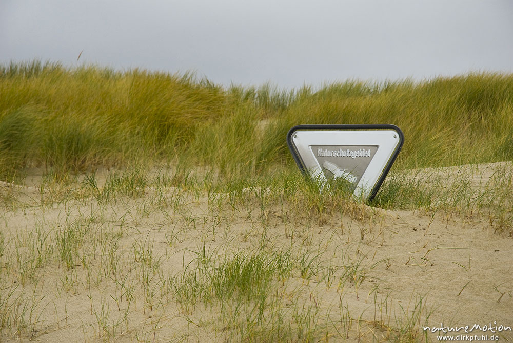 Schild "Naturschutzgebiet" vom Flugsand blank geschliffen und halb in den Dünen versunken, Amrum, Deutschland