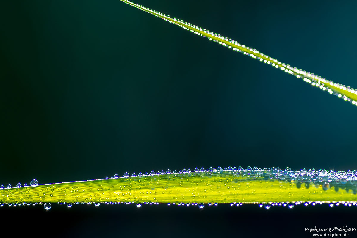 Schilf, Phragmites australis, Poaceae, Blätter, mit Tautropfen, Kiessee, Göttingen, Deutschland